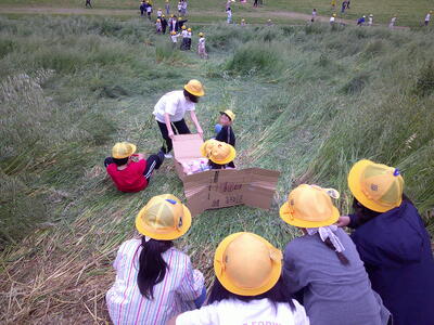 今朝、子供たちの持ち物を見ると、段ボールや虫取り網など様々な道具を持って登校する姿がありました。子供たちに「重たそうだね」と言うと、「明日、遊ぶためのものです」と、返してくれました。