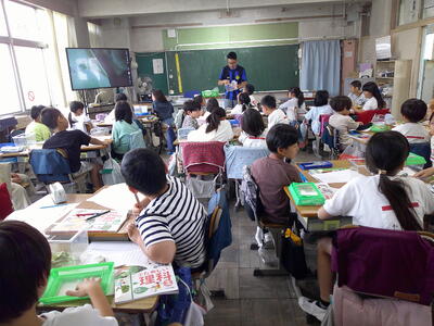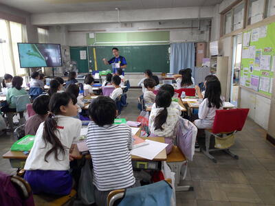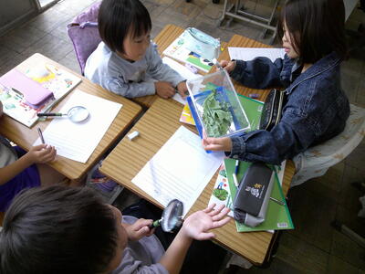 「モンシロチョウをそだてよう」の学習です。ここでは、身近な生き物である「チョウ」の飼育を行うことで、昆虫の成長する様子や体のつくりへの興味・関心を高めます。