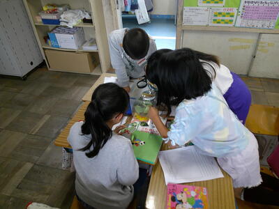 「校長先生、見て」「ここに、たまごいるよ」「ここに幼虫いるよ」と教えてくれる子供たち。