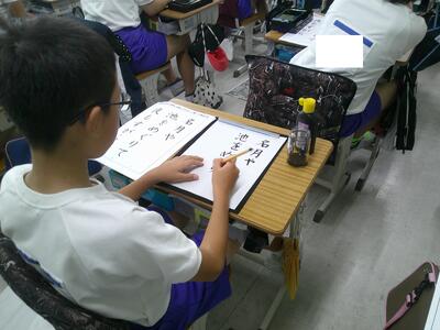 松尾芭蕉の作品を手本に、俳句を書く活動でした。文字の大きさ、配列、点画を意識して書くことができました。