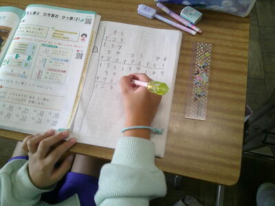 2位数の繰り上がりのある計算について、前時までの筆算で働かせた位ごとの数の見方を活用して、計算のしかたや筆算のしかたを考えることができました。