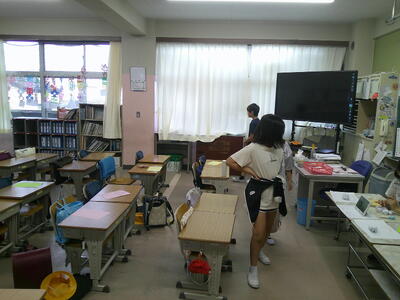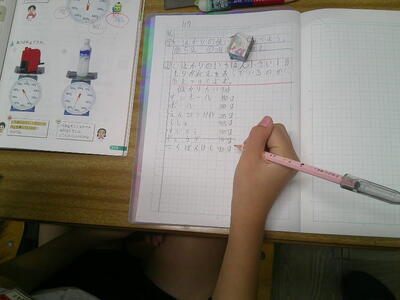 空気中に出ていく水の学習です。水が空気中に出て行くか、水を入れた入れ物を使って比べながら調べる資料を視聴しながら、進めています。
