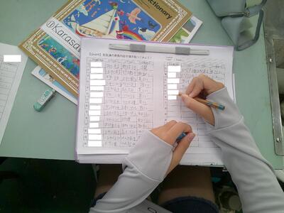 聞いている友達は、発表内容を聞き取りワークシートにまとめています。