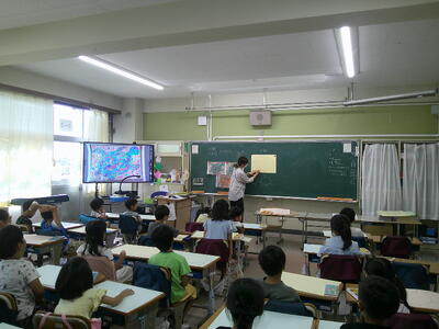 動画を途中途停止しながら、子供たちにクイズ形式で質問しながら学習を進めていました。ここでは、水滴はどこからきたの?と、子供たちに質問していました。