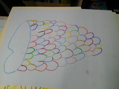 担任が子供たちと同じように描き、そのモデルを手本に一人一人自信をもって描いていました。これから、個性あふれる表現になっていくのが楽しみです。