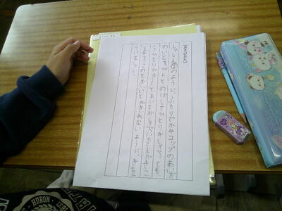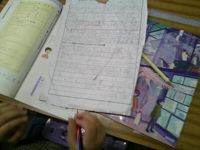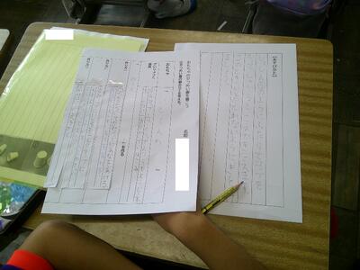 先日、社会科のスーパー見学をしてきたことを報告文として活用して取り組みます。教科横断的な学習です。