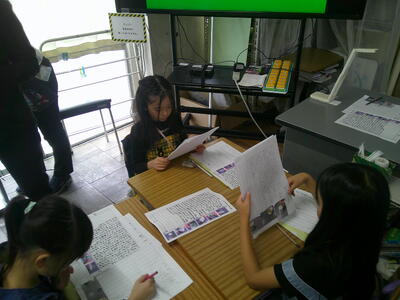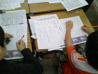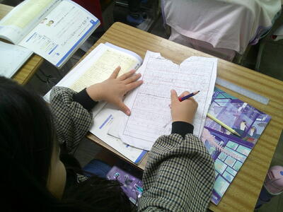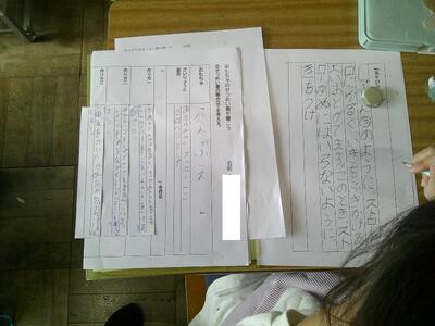 「取材したことを報告文に」の学習をしています。ここでは、多くの情報のなかから取り上げることを決め、関心のある事柄を集めて調べる力、また、文章全体における段落の役割を理解し、自分の考えが明確になるように注意して文章を構成する力を育てる単元です。