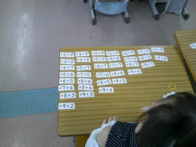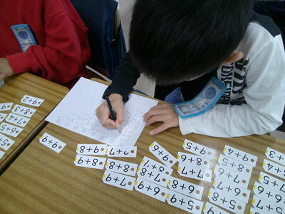 「たし算カードの並べ方を考えよう」を学習のめあてに、子供たちはたし算カードを並べて考えました。