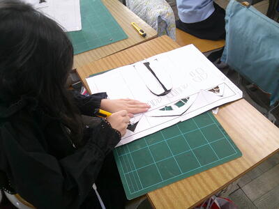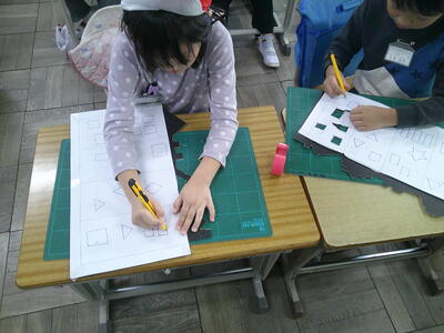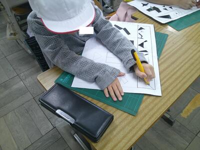 カッターを使った作業を行っています。