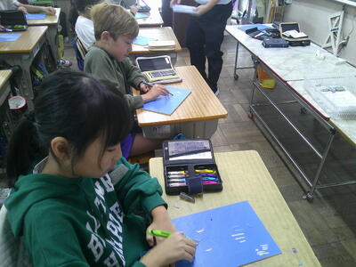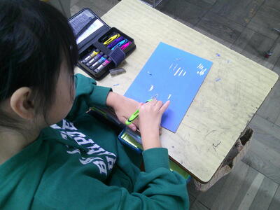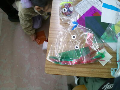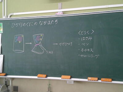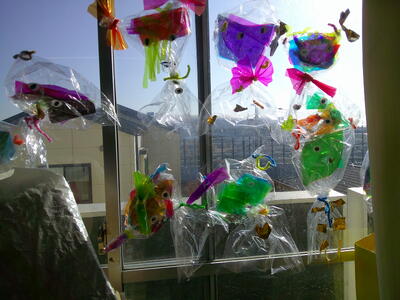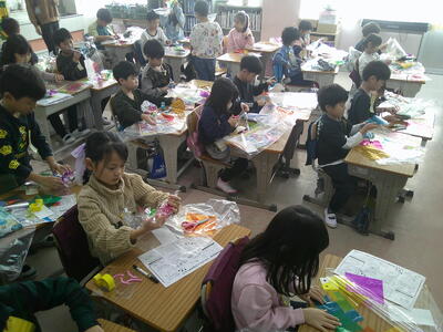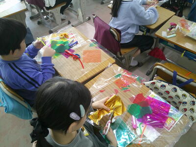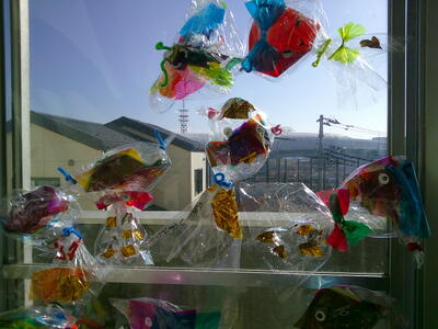 「ひかりのくにのなかまたち」という教材で、透明な袋に色セロハンや飾りを入れて、光を通すオリジナルの生き物や作品を作る授業です。子どもたちは、形や色を工夫しながら自由に発想し、窓際に飾って光を楽しみます。