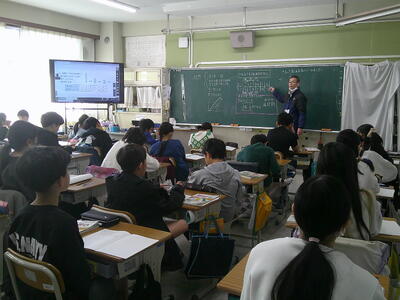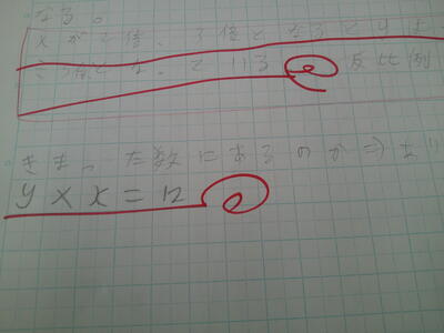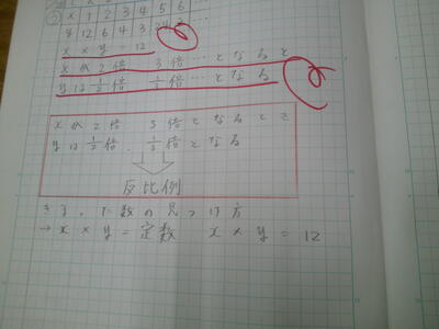 反比例の関係にある二つの数量について、比例の場合と比較しながら、二つの量の変化や対応の特徴を考えさせていました。