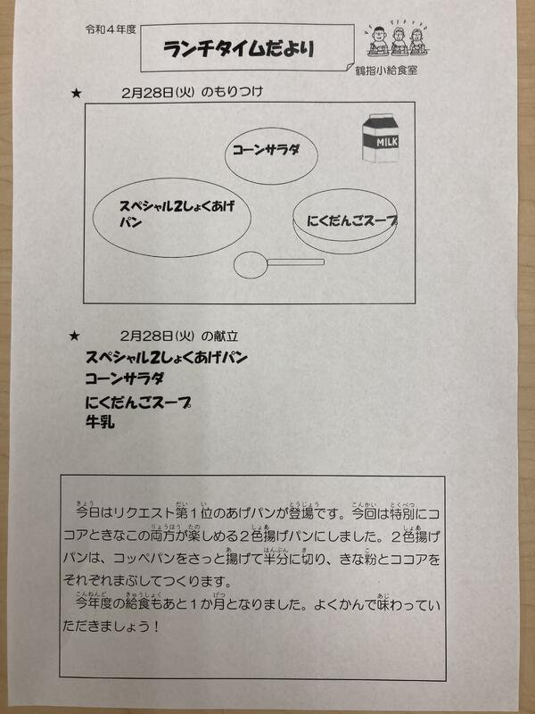 今日はおはなし給食のため、放送委員が「パンどろぼう」のよみきかせをしてくれました。教室をまわると、1年3組でとってもかわいいペンギンを発見しました!
