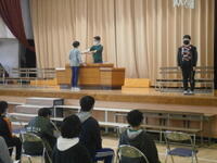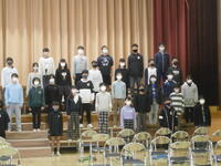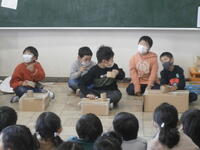 2年2組の子どもたちが、1年2組の子どもたちに国語の授業で学習した『かさこじぞう』の音読劇を披露しました。グループごとに場面を分け、どうどうと発表できました。一年間の成長は早いものです。