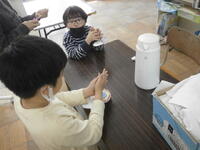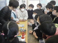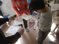 2年生が1年生にけん玉、だるま落とし、おはじきなどの昔あそびを教えています。2年生は、遊び方をどう分かりやすいように説明するか準備をしてきました。