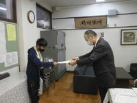 今日はいよいよ、証書をもらう練習です。前に出るときは右足から・・・、証書をもらうときは左手から・・・、頭の中で確認しながら練習しています。