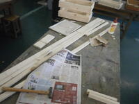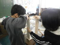 奉仕作業の制作が完成に近づいてきています。押さえている人、くぎを打つ人、皆で協力しながら楽しそうに作業しています。これもいい思い出になりそうですね。