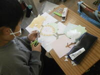 自分で描いた下絵にいろいろな材料を貼りつけ、紙版画の版を作っています。刷り上がりが楽しみです。