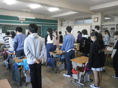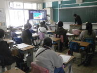 2月の朝会をオンラインで行いました。学校長の話に続いて、安全主任の先生から避難訓練についてと図書委員会の先生から百人一首大会の結果発表がありました。先生からの呼び掛けに画面に向かって答えたり、表彰チームのいるクラスでは拍手が沸き上がるなどオンラインならではの効果もありました。