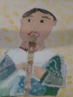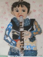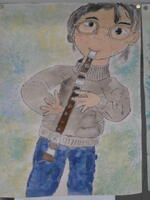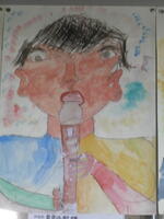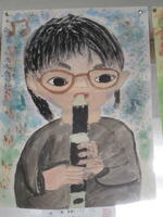 【3年 作品紹介】リコーダーを吹く自画像です。それぞれ特徴をとらえて、よく観察して描けています。