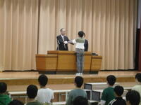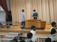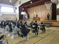 3月の朝会をオンラインで行いました。「3月はまとめの月。一年間を振り返り、4月から良いスタートをきりましょう」と話しました。その後、運動能力証の代表児童とミニバスケチームの表彰を行いました。