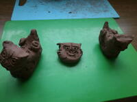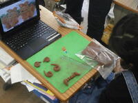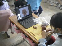 タブレットで調べた画面を参考にしながら、粘土でシーサーを作っています。一生懸命で皆、手がまっ茶色です。ちなみに写真で子どもたちが触っている参考作品は校長作です。