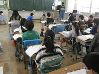 5年生が総合科の授業で鶴指小で『洪水が起こったら・・・』について調べています。教務主任の先生に聞いたり、校長室にも取材に来て熱心にメモを取っていました。
