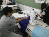 アイロン、ミシンを使ってエプロンづくりに取り組んでいます。針に糸を通すのも真剣そのものです。