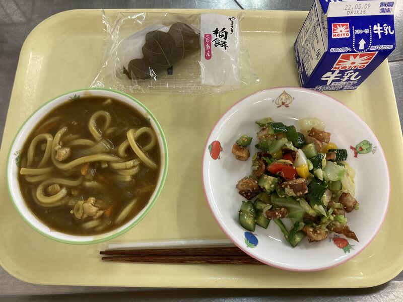 カレーうどん、ちくわのコロコロサラダ、かしわもち、牛乳