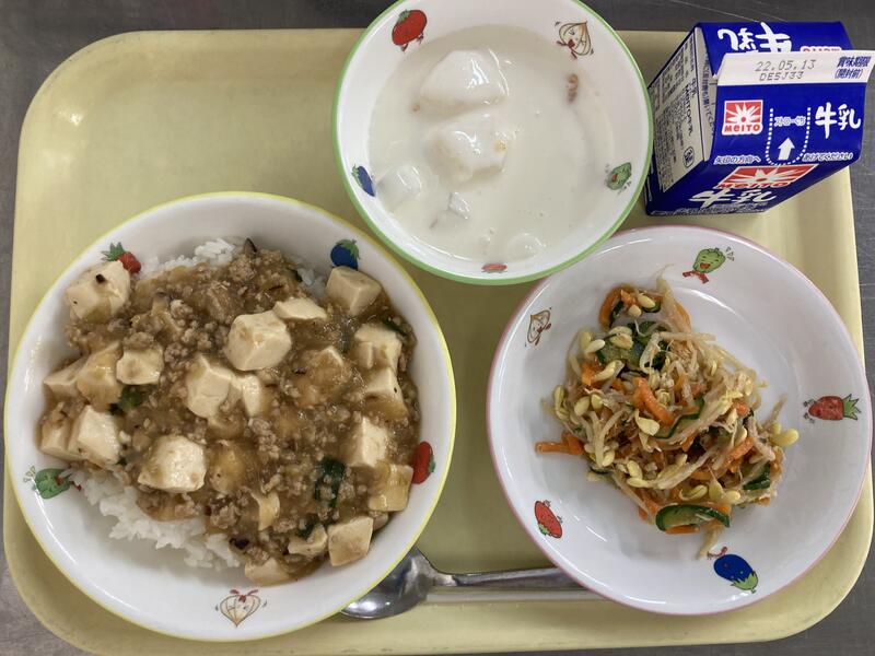 麻婆豆腐丼、豆もやしとささみの中華和え、フルーツヨーグルト、牛乳