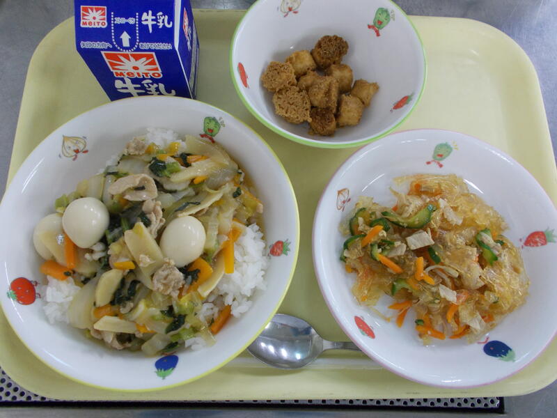 あぶ玉丼はある食材の頭文字をとってついた料理です。どんな食材かわかりますか?実は、あぶたまには「あぶらあげ」「ぶたにく」「たまねぎ」「たまご」の4つの食材がかくれています。今日は油揚げ・豚肉などの食材をかつおだしで煮てたまごでふんわりととじました。丼ものはついよく噛まずに食べがちです。ひとくち30回を意識してよくかんで味わっていただきましょう!