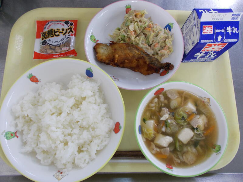 ごはん、ほきのたつたあげ、春キャベツのゴママヨネーズ、マロニースープ、黒糖ビーンズ、牛乳