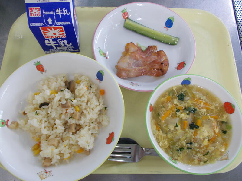 ハムコーンピラフ、マーマレードチキン、フレンチきゅうり、千切り野菜と卵のスープ、牛乳