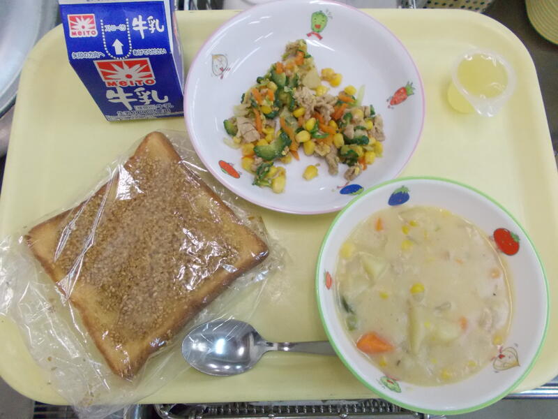 セサミトースト、焼肉サラダ、コーンクリームシチュー、ひとくちりんごゼリー、牛乳