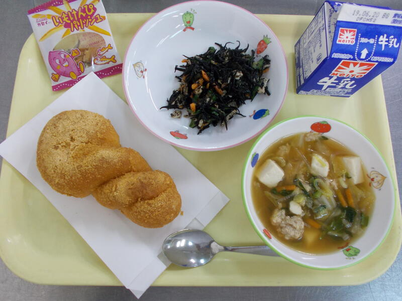 きなこあげぱん、ひじきのマリネ、にくだんごスープ、芋けんぴパリッシュ、牛乳