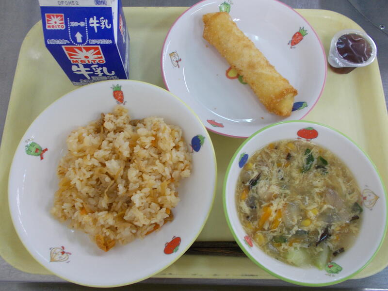 キムタクごはんの「キムタク」とは「キムチ」と「たくあん」のことです。漬物をよく食べる文化のある長野県で生まれた給食のメニューです。少しピリ辛の味付けですが、たくあんの食感がアクセントになっています。またポテト春巻きは旬のじゃがいもをつぶしマヨネーズで味つけして、春巻きの皮でひとつひとつ包み揚げました。ボリュームも満点です。今日もよくかんで味わっていただきましょう!