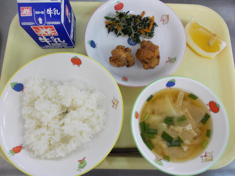 ごはん、鶏肉のからあげ、いそあえ、にらとじゃがいものみそ汁、みしょうかん、牛乳