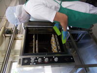 今日は鶴指小の給食室でも、約300個分のたまごを使ってバターカステラを焼きました。甘い香りが口いっぱいに広がります。