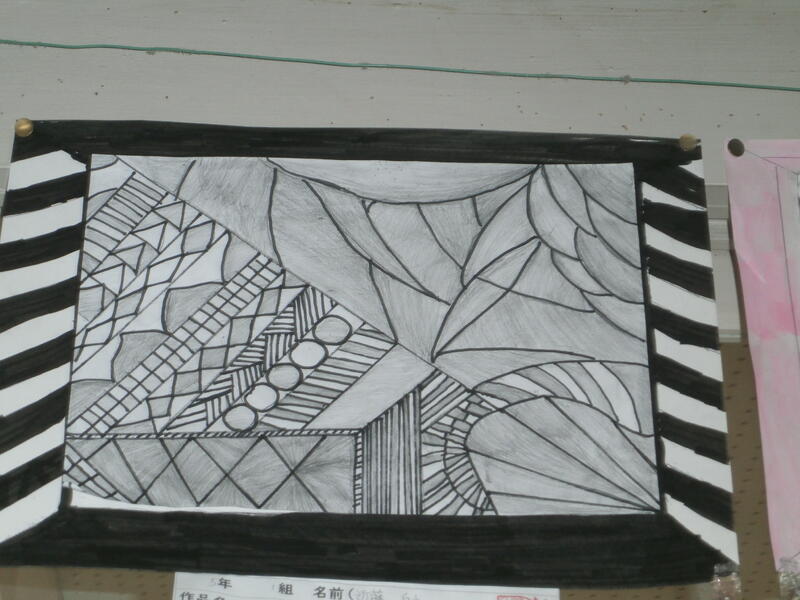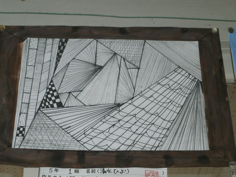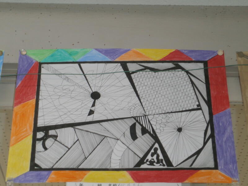 5年生の廊下に掲示されている図工作品「線からはじまる わたしの世界」です。