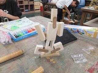のこぎりで切った木端にジョイントをくぎで打ち付けつないでいきます。くぎで打ち付けた部分は動くので、それぞれ工夫を凝らした作品ができ上りそうです。