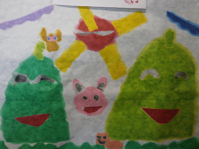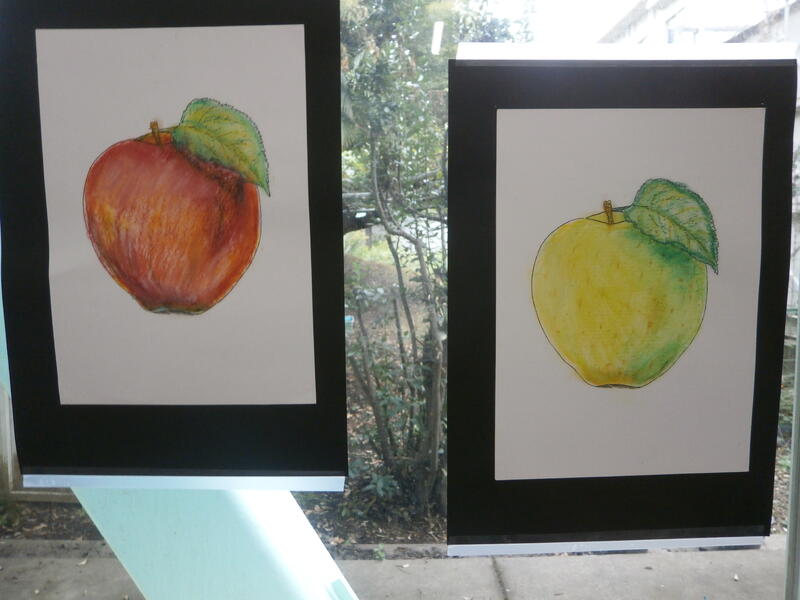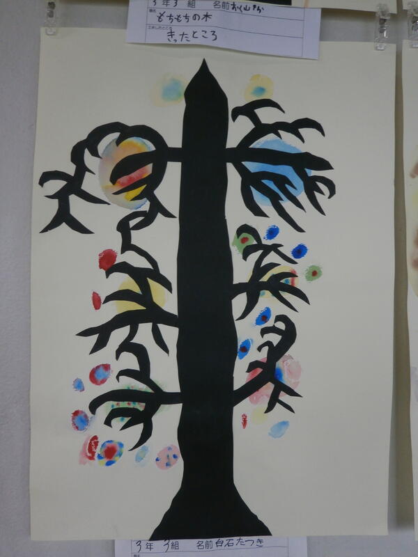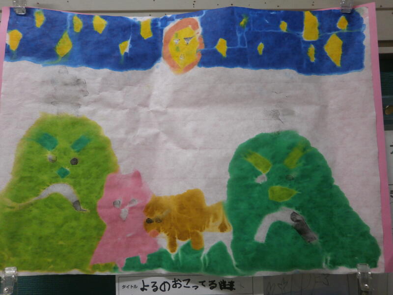1階昇降口前に、わかば学級児童の「パステル画」が掲示されていました。
