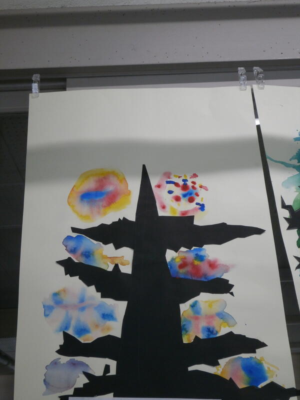 1年生図工「遠足の絵」。初めて、絵の具で彩色していました。