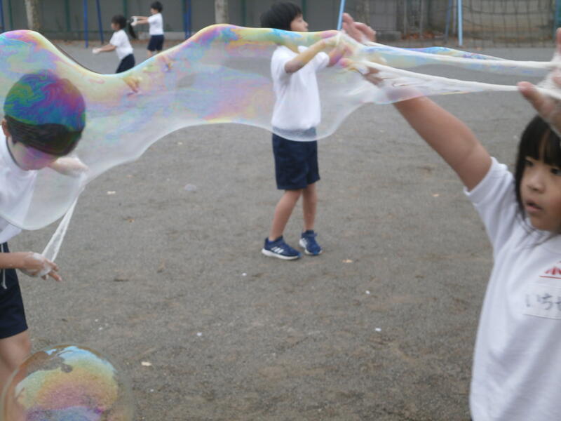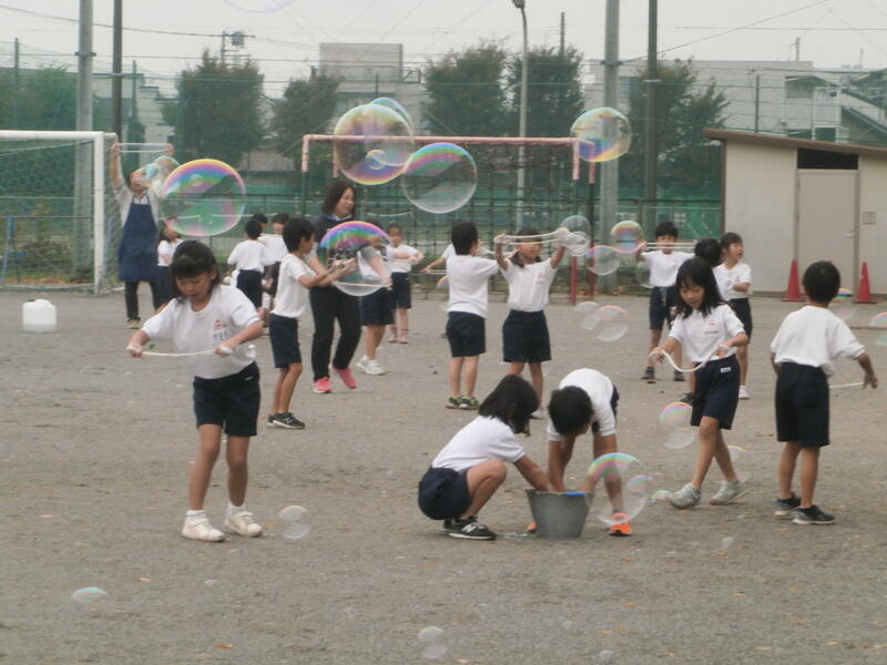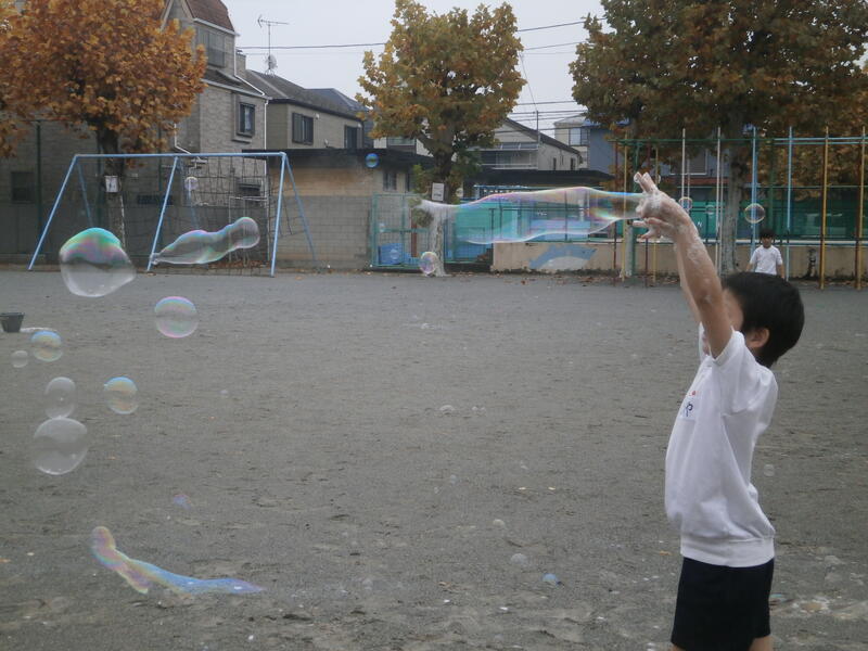校庭中にきれいなシャボン玉が舞い上がっていました!