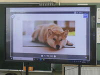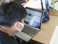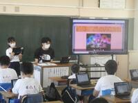 自分で選んで調べたテーマに沿って、タブレットを使用しクラスで発表しています。見ている人は、それぞれの良いところを評価しています。
