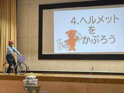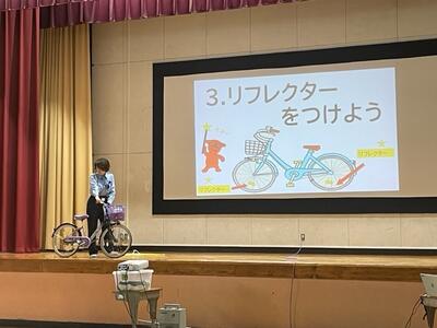 2時間目は、3年生が自転車安全教室で、自転車の交通ルールとマナーや、自分の体に合った自転車の選び方などのお話をしていただきました。