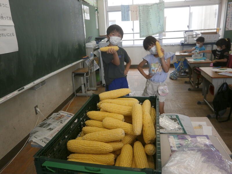 2年生が、全校の給食で使うトウモロコシの皮むきをしてくれました。