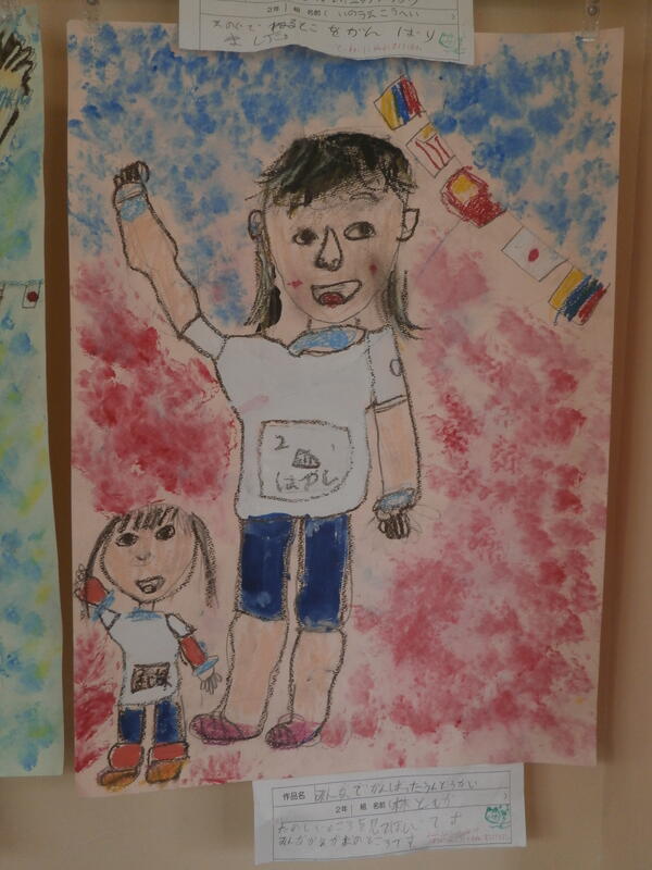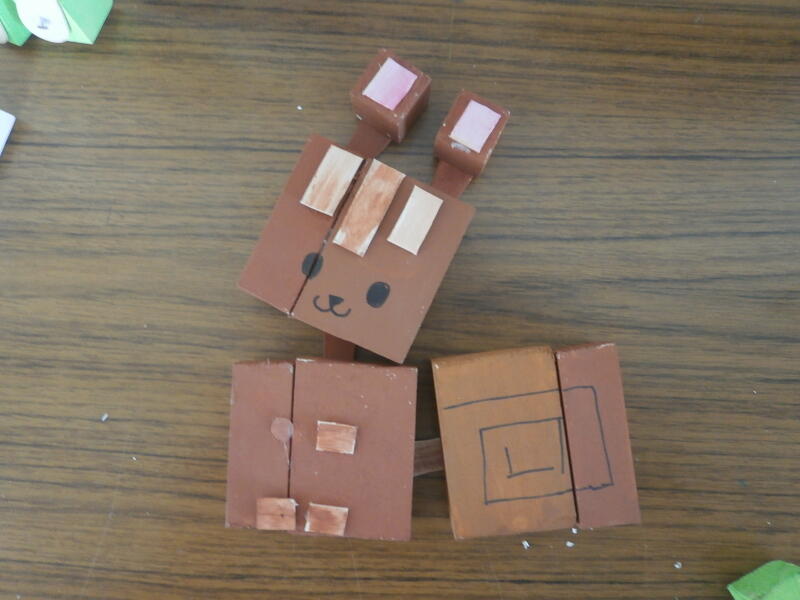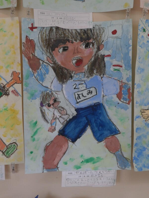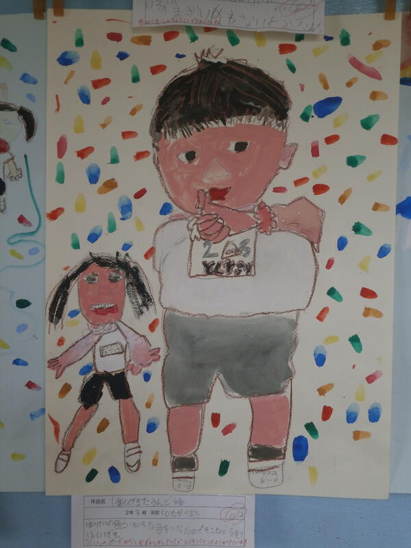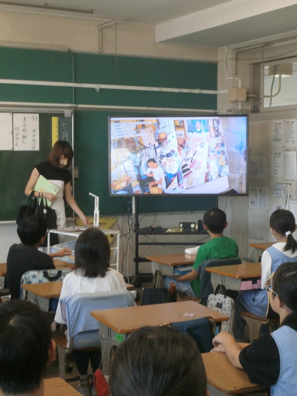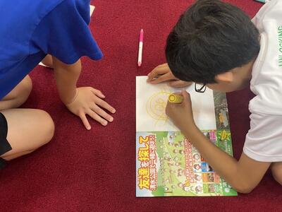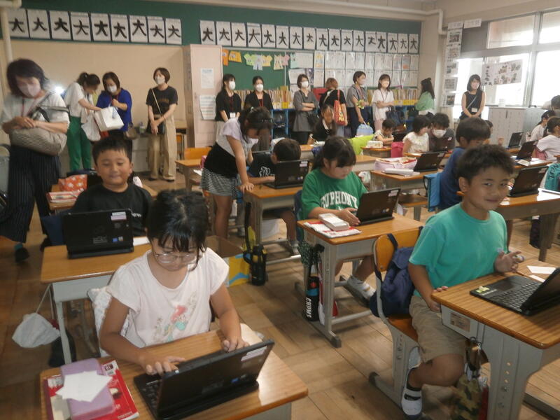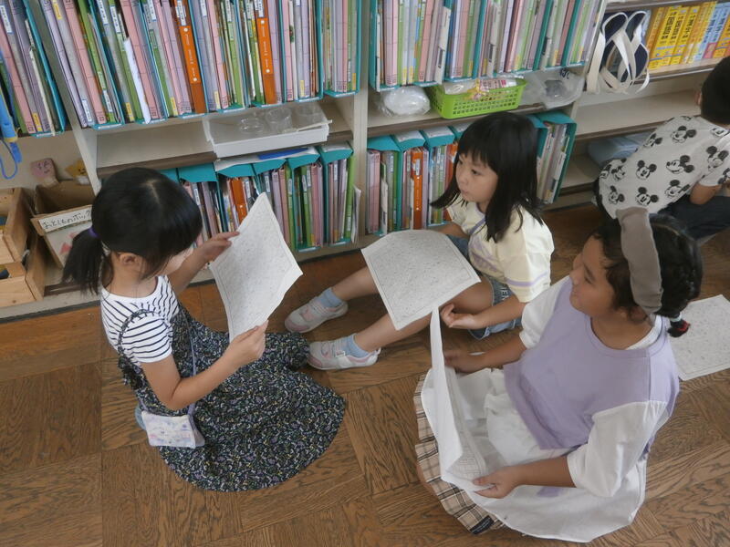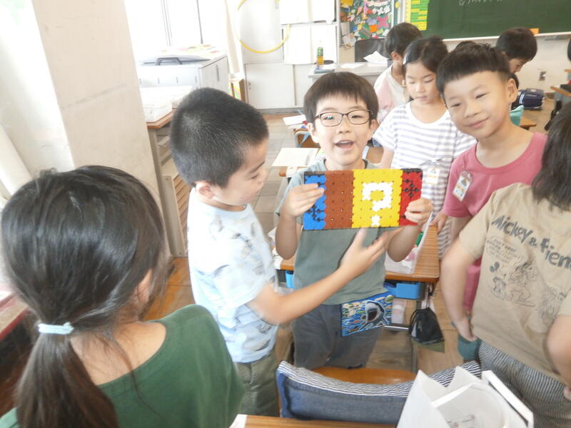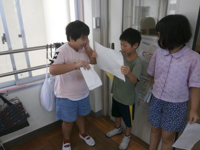 教室では、宿題で作った作品をを見せ合っている児童もいました。