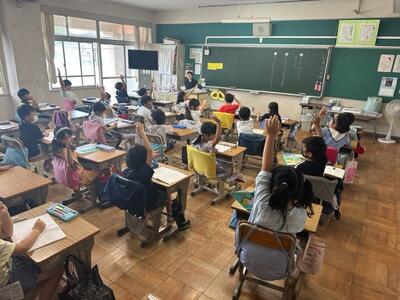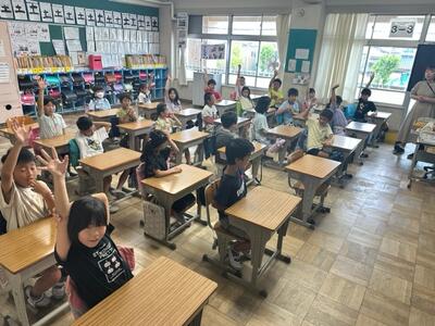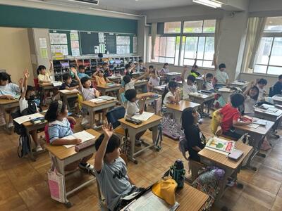 校長先生からは、4つの質問がありました。しっかりと話を聞きながら、手をあげる子供たち。