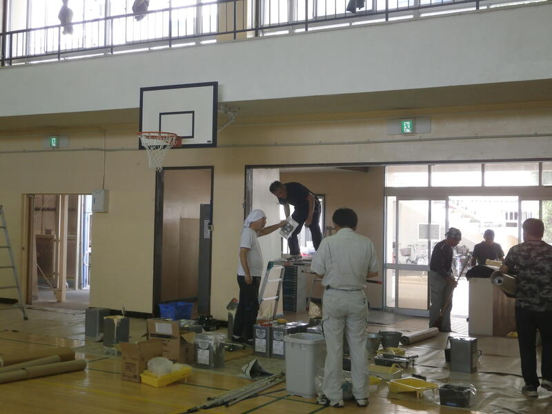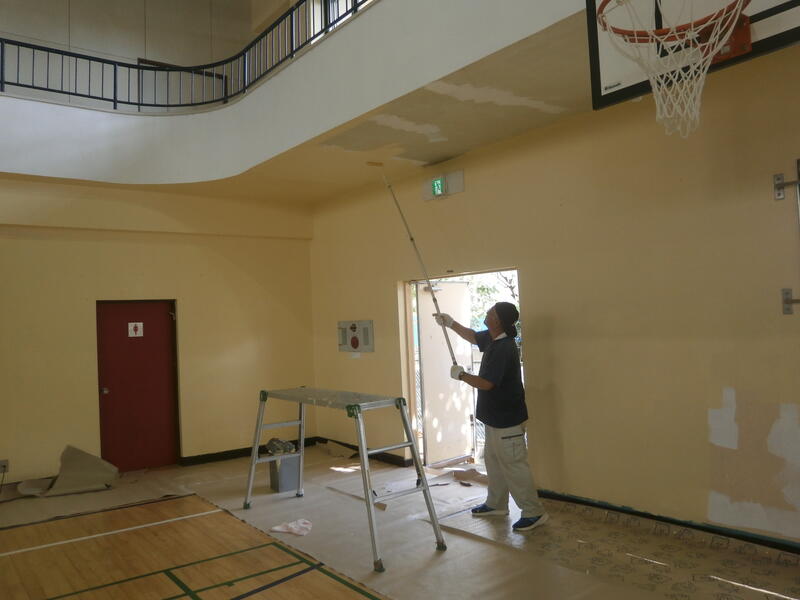 8月2日、3日と近隣学校の用務員さんが集まり、本校体育館の壁面とギャラリーの床を塗り直して