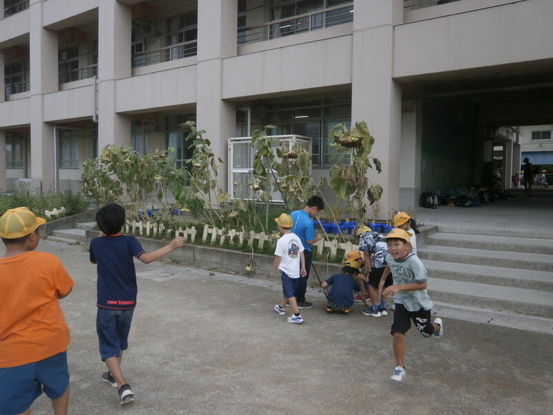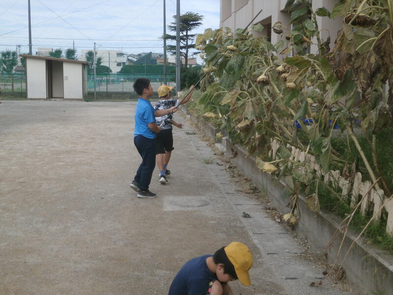 3年生が育てているひまわりがぐんぐん成長しています。