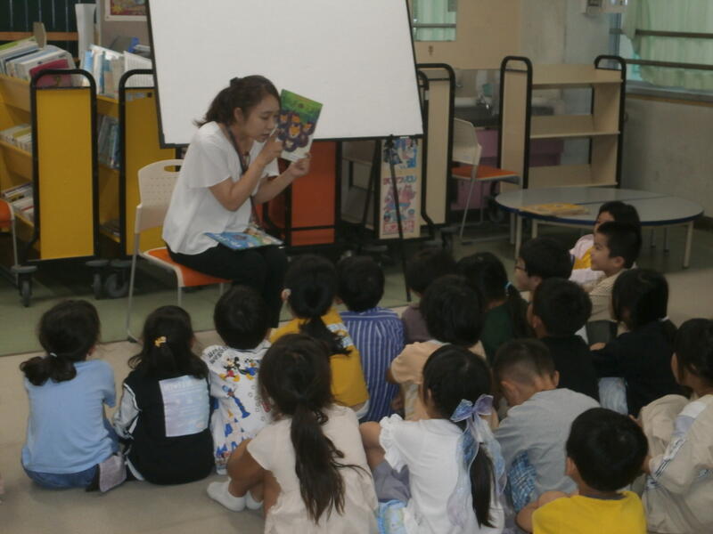 図書室で1年生が、絵本の読み聞かせを聞いていました。